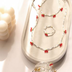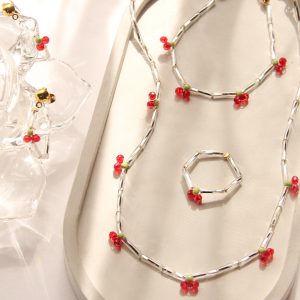 Crafted with sparkling beads that refract and scatter light, each necklace, bracelet, and pair of earrings in this collection plays with radiance, shifting in glow and color with every movement. The collection is divided into seven colors of the spectrum—red, orange, yellow, green, blue, indigo, and violet—each representing a different personality, emotion, and wavelength of energy. The addition of pearls enhances the ethereal aesthetic, symbolizing purity, harmony, and the soft glow of moonlight on water.