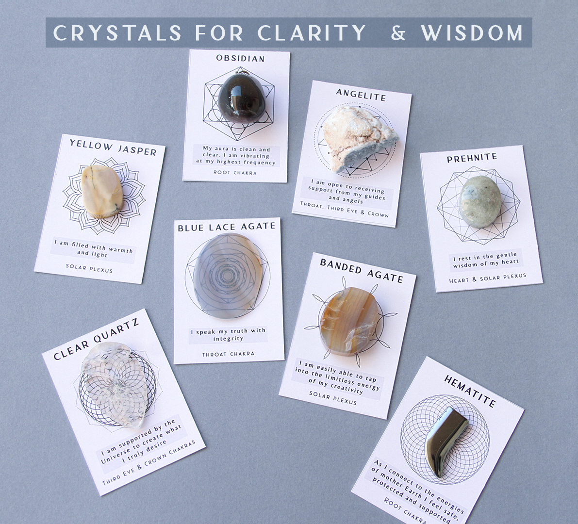 Obsidian | Angelite | Yellow Jasper | Blue Lace Agate | Banded Agate | Prehnite | Clear Quartz | Hematite