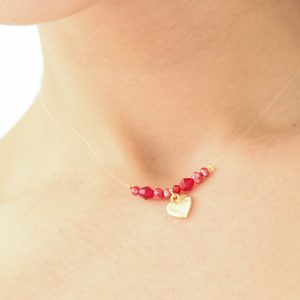A glowing symbol of passion and warmth, the Ember Heart necklace is crafted with radiant red beads that shimmer like embers in soft light. At its center, a delicate 18k gold-plated heart charm floats gracefully, suspended on an invisible thread — giving the illusion of a heart glowing on your skin.